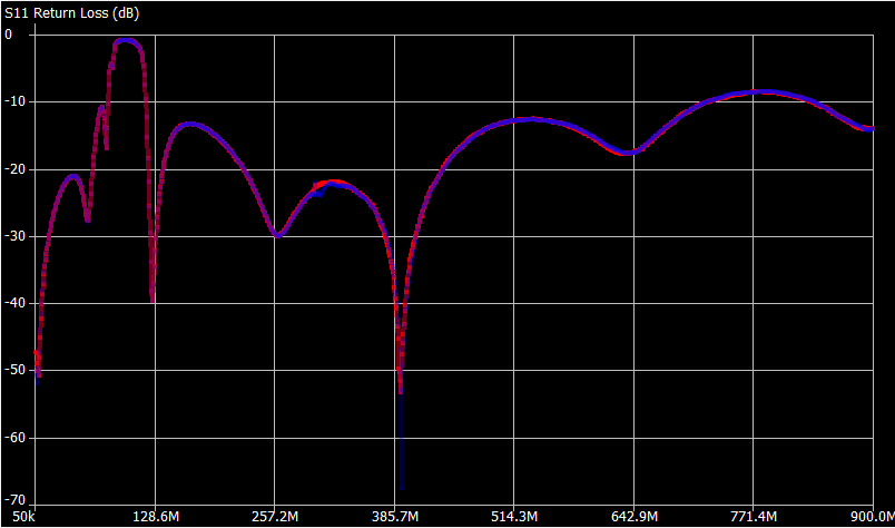 Below is an Overlay of S11 and S21 scans from 50KHz to 900 MHz of the rtl-sdr.com FM bandstop filter using the original design and the clone. There is a small difference between the two scans at 300MHz on S11, which is likely do to the VNA design more than clone vs. original. The fundamental output of the design only goes up to 300 MHz. Beyond that the design uses harmonics with decreased performance. Variable performance at the cross-over point is not surprising.